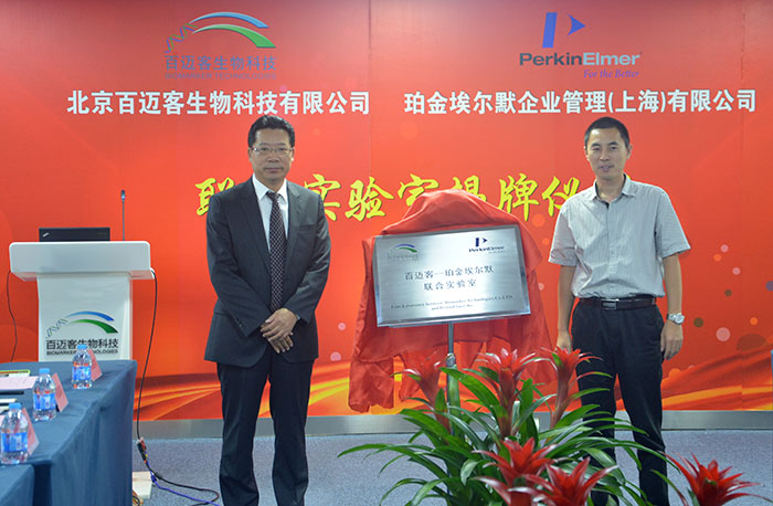 8月14日,北京百邁客生物科技有限公司與珀金埃爾默企業管理(上海)有限公司舉行了聯合實驗室揭牌儀式。北京百邁客生物科技有限公司創始人、董事長兼 CEO鄭洪坤先生,珀金埃爾默亞太區生命科學副總裁兼總經理、大中華區總裁顧憲進先生,偕同多位雙方代表參加了揭牌儀式。