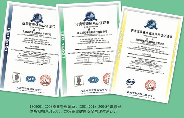 近日,北京百邁客生物科技有限公司順利通過ISO9001:2008質量管理體系、ISO14001:2004環境管理體系和OHSAS18001:2007職業健康安全管理體系認證(簡稱QES),這標志著公司向管理標準化、規范化和程序化方向發展邁進了一大步。