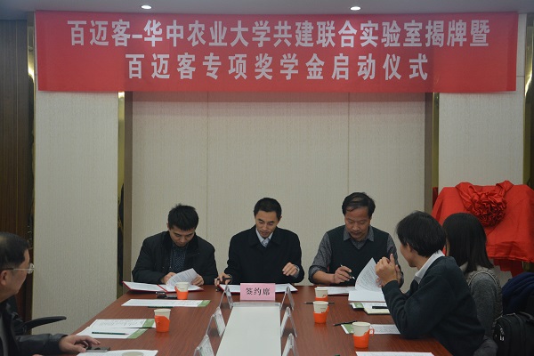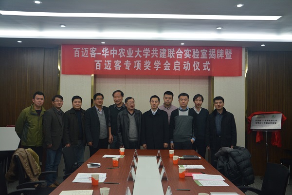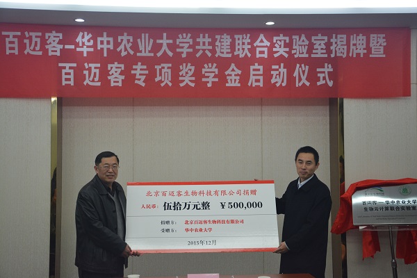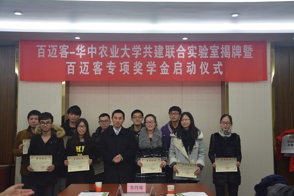 在商用云計算平臺成功上線后,百邁客啟動了云平臺戰略又一重大舉措-全國重點區域的布點及人才隊伍建設。2015年12月1日 ,“百邁客-華中農業大學共建聯合實驗室揭牌暨獎學金頒發儀式”在華中農業大學隆重舉行。