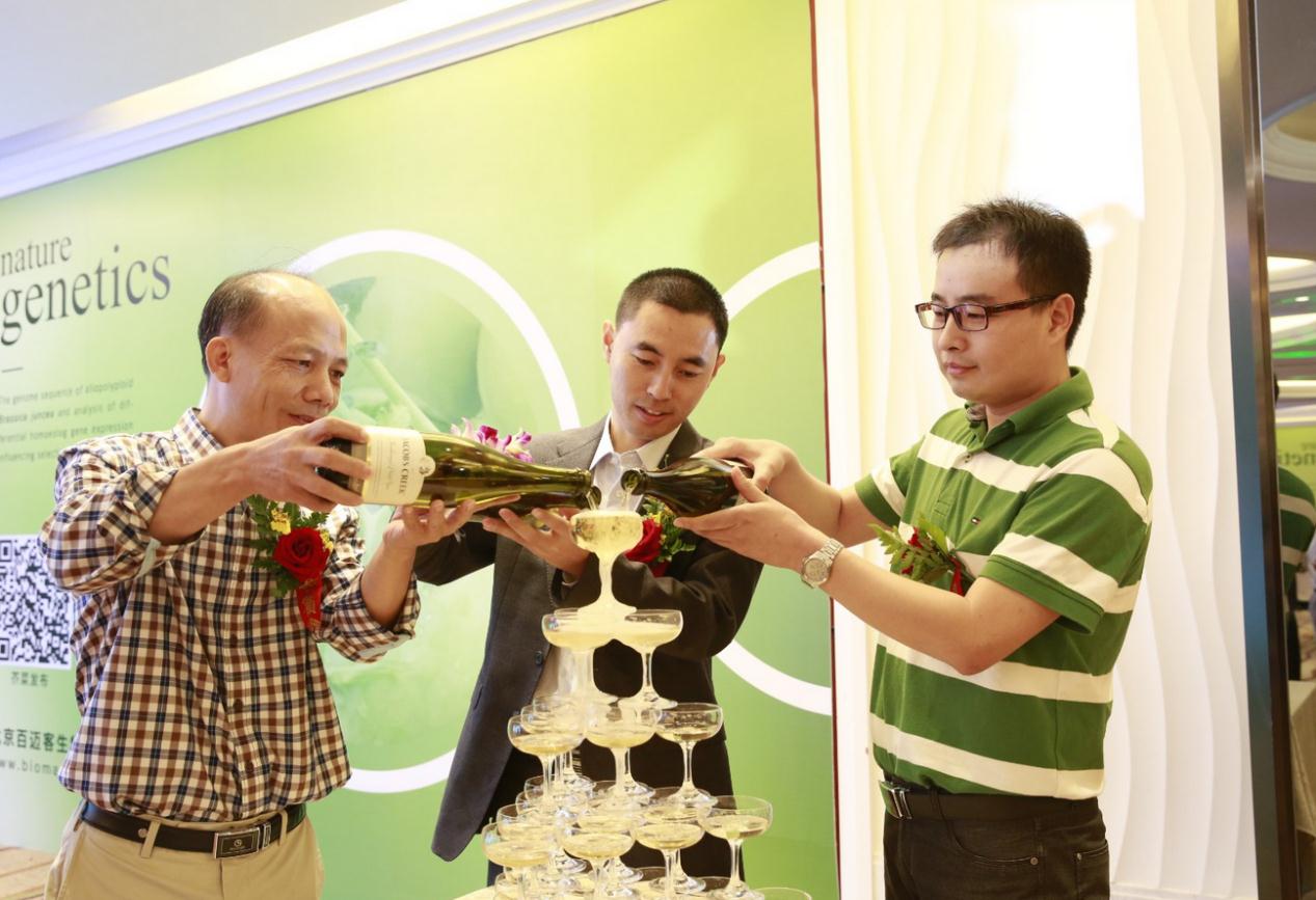 會中,眾嘉賓同時為發布會揭幕,迎來全場嘉賓們的矚目及掌聲,制作精美的大型雜志模型浮現,同時芥菜基因組數據全球同步發布。接下來中國農科院王曉武教 授、百邁客鄭洪坤總裁、浙江大學楊景華教授一起澆注香檳塔。于軍老師等嘉賓隨后一同舉杯,共同祝賀蕓薹屬科研成果的發布。會上有二十幾家媒體到場,媒體提 問環節也十分引人注目,cctv4、科技日報提出了百姓關注的餐桌問題;測序中國、生物探索、生物谷行業媒體就兩篇論文的基因組發布技術和潛在的應用前景 與嘉賓進行探討,嘉賓們紛紛做了精彩的回答。