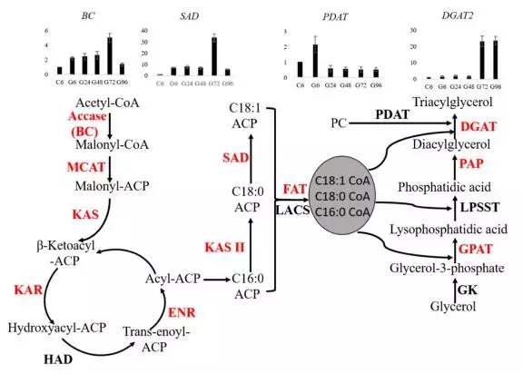 藻類和植物中脂肪酸的生物合成主要在葉綠體中進行。乙酰-CoA作為合成的起始物質。基于轉錄組測序,小球藻質體中脂肪酸合成基因被鑒定到。在葡萄糖處理情況下,這些基因大都表達量上調。另外這次測序結果中還發現幾個基因對應的不同轉錄本。由于BC和SAD是脂肪酸合成的限速酶基因,做了進一步分析,發現BC和SAD表達量從6h到72h表達量持續上升,對應的三酰甘油含量從24h到96h持續增加。