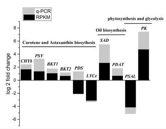 作者選了10個與蝦青素和三酰甘油合成有關的unigenes進行了RT-PCR驗證,其中9個基因的表達趨勢與RNA-seq結果一致。只有PDS兩種結果不同,可能是RNA-seq結果不準確,因為前人的研究成果中,葡萄糖是上調PDS表達的,與本文中RT-PCR結果一致。