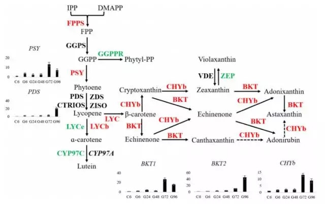 在轉錄組測序結果中,發現MEP通路中的8個基因都被鑒定到,但是在MVA通路中只有2個基因被檢測到,其中HMG表達不顯著,ACAT表達量下降。這些結果表明小球藻中蝦青素的合成通路中IPP和DMAPP是MEP通路合成的。其中,發現一個可能編碼β-胡蘿卜素激酶(BKT2)與數據庫中的BKT1比對率僅為56%。功能分析發現BKT2可以轉化β-胡蘿卜素成為角黃素。下圖為蝦青素合成通路圖。在葡萄糖處理情況下,與蝦青素合成相關的6個基因上調差異表達。在小球藻中,葡萄糖誘導蝦青素的合成,伴隨著BKT1,CHYb,PDS在24h內上調表達。為研究轉錄組水平基因表達量與產物含量的關系,分析了5個限速基因的表達量,這些基因在葡萄糖處理72h或92h表達量達到最高,相應的,蝦青素的積累量也在96h達到穩定水平。