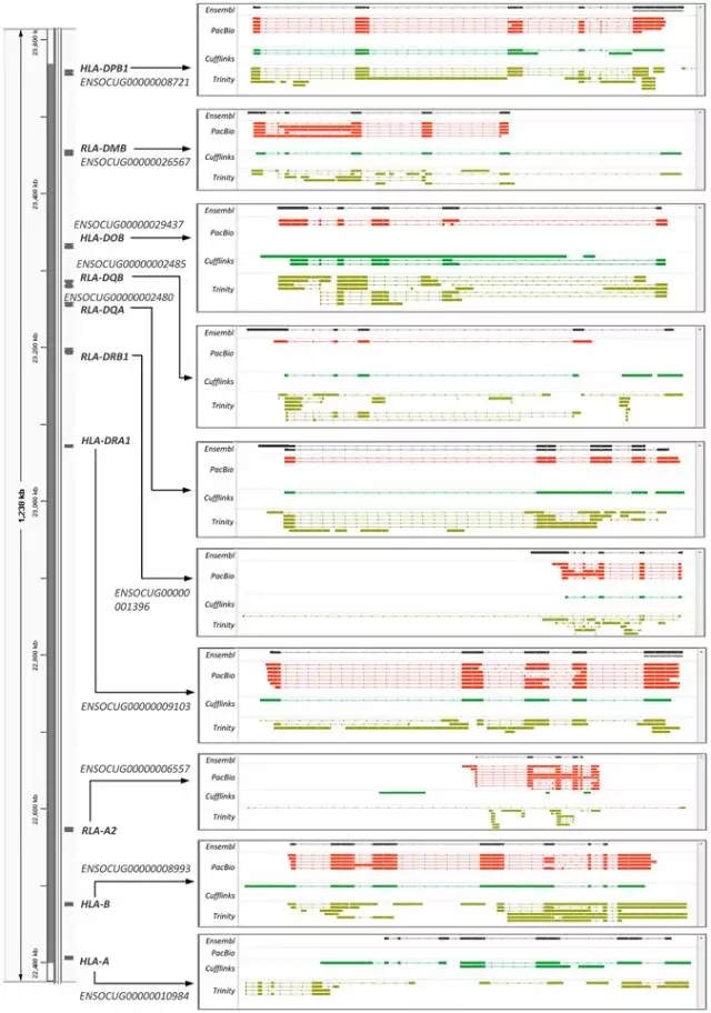 Figure 4.基因通過PacBio所測轉錄本和組裝得到的轉錄本還原10個MHC基因。染色體定位、命名和每個基因的Ensembl編號(在左側)。