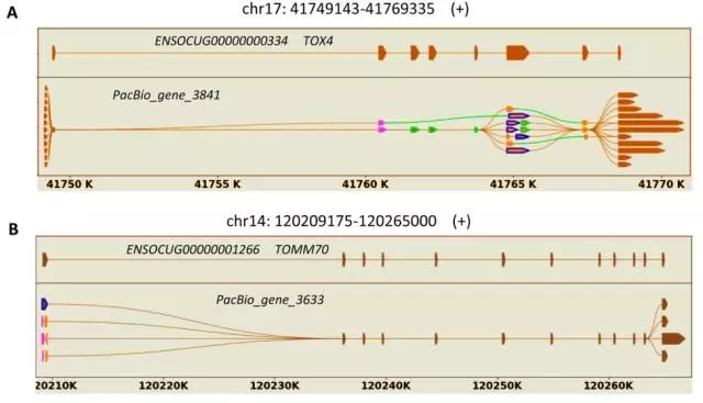 如圖所示:從上到下排列依次為,Ensembl中的參考轉錄本(黑色),外顯子-內含子結構通過一個個方框分開;PacBio transcripts(紅色);Cufflinks(綠色)和Trinity(褐色)為組裝的轉錄本。