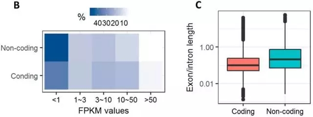 通過比對到參考蛋白數據庫,有30,183個轉錄本可編碼蛋白、6,003個轉錄本不能編碼蛋白,并且這些非編碼的轉錄本外顯子少、表達量低、且外顯子與內含子在長度上的比值相較于可編碼蛋白的轉錄本略高(Figure 3)。對轉錄本進行分類(Table 2)。