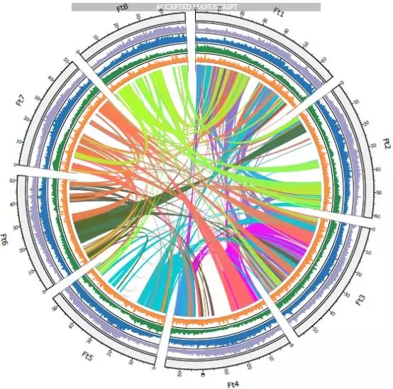 苦蕎通過K-mer預估基因組大小約為489Mb,流式細胞儀預估為540Mb。共組裝出來489.3Mb的基因組序列,共8778個Contigs,Contig N50=550.7kb。通過Hi-C數據將436.4Mb的序列錨定到8條染色體上(定位比例為89.18%)。然后再通過光學圖譜數據進行校正。三代數據的準確性通過二代評估為99.96%,并且在基因區具有更少的錯誤存在。