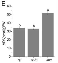 類病變突變體通常會表現出自發性的細胞程序性死亡(PCD),作者通過伊文思藍染色比較了lmd與NT、oe21的細胞死亡情況(圖4);丙二醛含量檢測間接反映了lmd細胞損壞程度也更高(圖5);