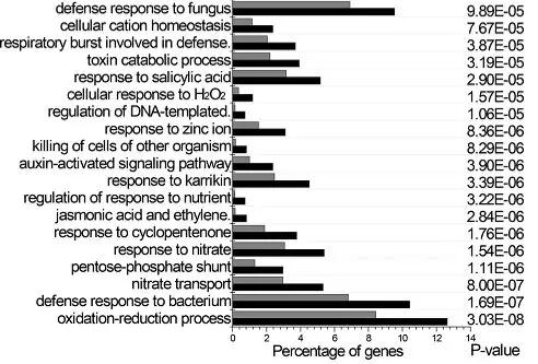 為了深入了解lmd體內的分子水平變化,作者進行了轉錄組測序。對差異基因進行分析發現了許多與致病相關的基因,如WRKY、谷胱甘肽-轉移酶(GST)、乙烯反應因子(ERF)和絲氨酸/蘇氨酸蛋白激酶(serine/threonine-protein kinase),這些都已經被研究證實與防御反應相關。GO富集分析顯示,參與催化活性、抗氧化活性、免疫系統過程和刺激響應的差異基因發生了顯著富集(圖9)。