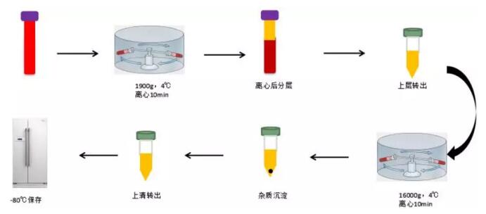 使用EDTA抗凝管采集血液樣品(采集后的血液樣品可置于室溫或4℃短暫保存,但不得超過1h)。1900g(或3000rpm),4℃,離心10min。小心轉移上層血漿(黃色)至新的1.5ml離心管中,槍頭不要觸碰中間層(白細胞和血小板層)。一般情況下,10ml的血液可分離出4-5ml血漿。將分離出的血漿16000g,4℃,離心10min。槍頭不要觸碰到管底一側的雜質,小心轉移上清到一個新的1.5ml離心管中,-80℃保存。大體積干冰運輸。