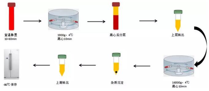 使用含凝血激活劑的采血管或普通真空采血管采集血液樣品,室溫靜置10-60min使血液凝集。1900g(或3000rpm),4℃,離心10min。小心轉移上層血清(黃色)至新的1.5ml離心管中,槍頭不要觸碰中間層(白細胞和血小板層)。一般情況下,10ml的血液可分離出3-5ml血清。將分離出的血清16000g,4℃,離心10min。槍頭不要觸碰到管底一側的雜質,小心轉移上清到一個新的1.5ml離心管中,-80℃保存。大體積干冰運輸。