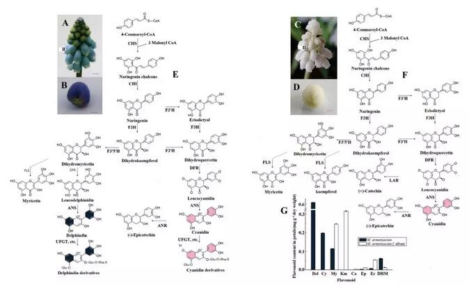 葡萄風信子(Muscari)是一種重要的觀賞性球根植物,具有獨特藍色、花形和甜香。天然突變種白色風信子為探究某些潛在生化特征,特別是顏色相關的復雜代謝網絡研究提供了機會。據報道,花青素是風信子花色的主要色素。藍色花主要由飛燕草色素(Del)決定,紅色花由花青色素(Cy)決定。花青素是植物科學中研究最多和最了解的化合物之一,然而,在不同植物中調控花青素分解代謝的分子機制還遠遠沒有定論。