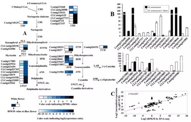 通過將藍色和白色風信子花青素顏色代謝相關關鍵基因比較分析,顯示出了與一般研究相反的結果,即在白色風信子花中,大部分花青素合成相關的uni-transcripts表達豐度高于在藍色花中的表達。進一步研究發現,在白色花瓣提取物中檢測到大量的類黃酮化合物,其中許多與花青素共享相同的中間體或酶。這可能是花青素含量與葡萄風信子花色苷生物合成基因表達量不相關的主要原因。最后,選擇花色相關基因qRT-PCR驗證,驗證測序結果的準確性。