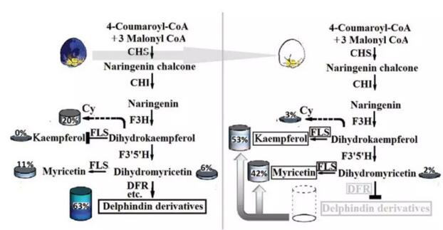 在藍色風信子中檢測到與Del合成相關的部分同源序列的表達上調,在某些情況下,高出> 1000倍。結合HPLC分析結果,DFR可能是白色葡萄風信子中藍色色素沉積(Del)消失的靶基因。另外,FLS和DFR在共同的二氫楊梅素底物之間的強烈競爭,可能部分地阻斷Del的合成并引起其他類黃酮化合物,如楊梅素的產生,由此進一步消除白色風信子中藍色色素沉積。