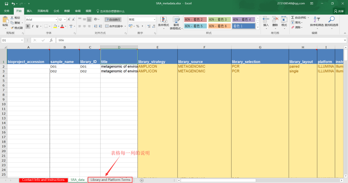 第七步:第六步表格上傳完成后,需要接著上傳Metadata表格,主要填寫樣品建庫測序的信息和需要上傳的文件名,填寫完成后也是導入到文本文件中然后上傳;