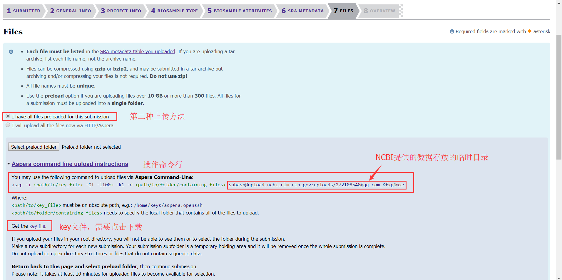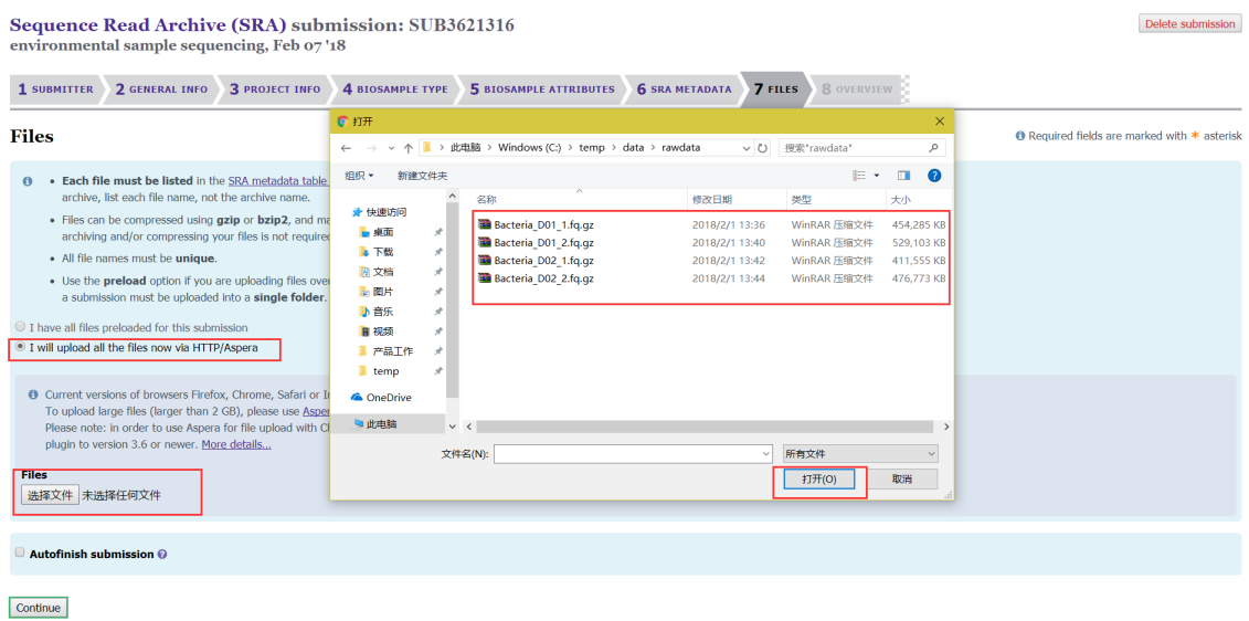 第八步:重點來了,這一步是將我們的數據傳到NCBI的服務器上,需要下載安裝一個軟件Aspera(http://downloads.asperasoft.com/connect2/,windows下也可以安裝)。軟件安裝完成后有兩種上傳方法:(1)可以直接上傳,適用于數據量小、樣本量小的項目;