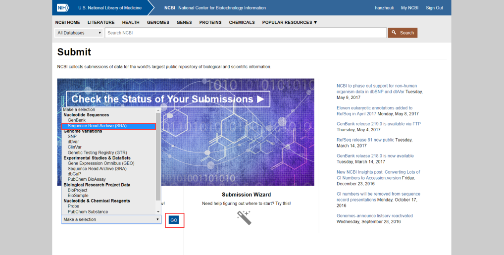 首先,登錄NCBI主頁面后點擊Submit進入到數據上傳頁面,然后選擇SRA數據庫點擊GO按鈕后接著點擊New submission(操作界面見下圖);
