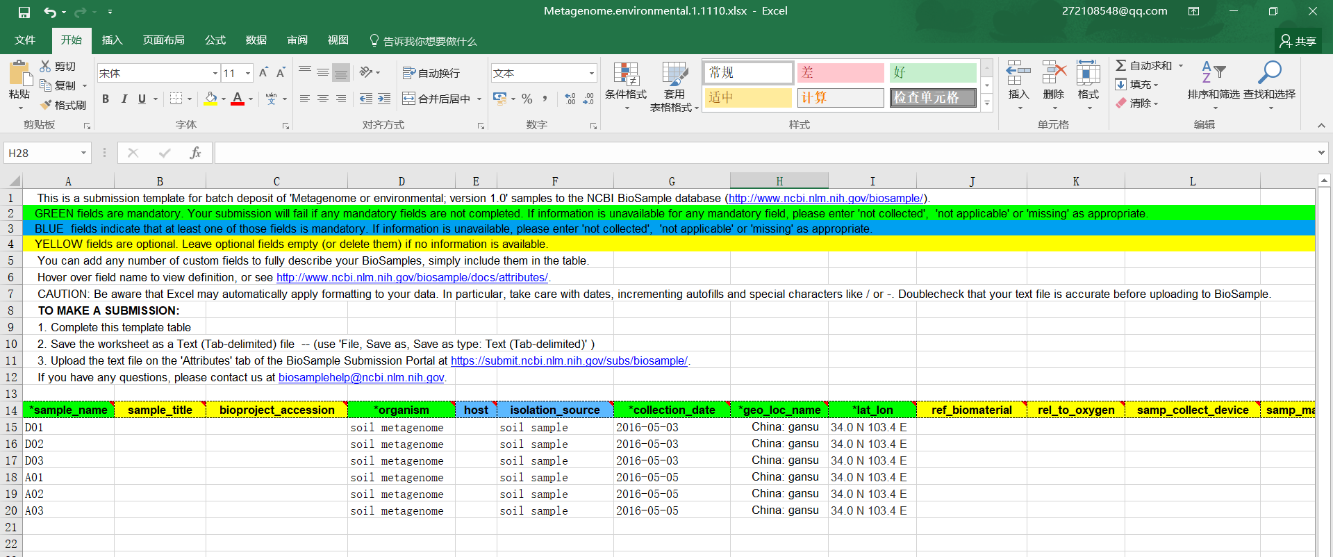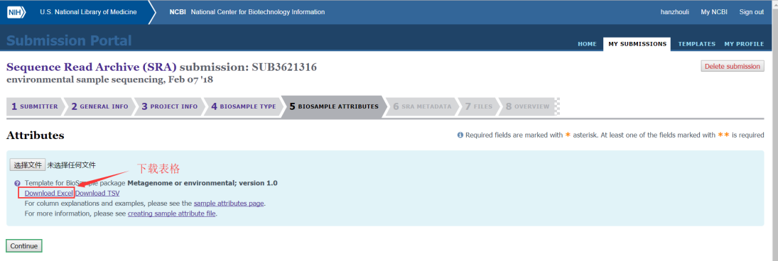 第六步:樣本具體信息,需要我們下載表格填寫,表格中綠色的為必填,藍色的需要至少填一個,其它內容可以選填或者不填寫,如果是生物學重復需要添加一列replicate,填寫完成后需要將信息粘貼到文本文件中(TXT格式),然后上傳到網站上;