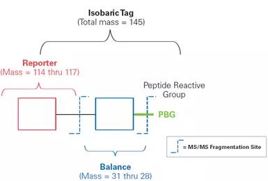 iTRAQ試劑由三部分組成:報告基團;質量平衡基團和肽反應標記試劑基團,可形成4種或8種相對分子質量均為145的等量異位標簽。