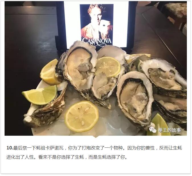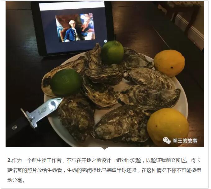 我頓時有點討厭卡薩諾瓦這個人,你說你亂搞就亂搞吧,為啥對生蠔這么狠,害得現在人類和生蠔搞這么僵。我對18世紀之前的那個田園時代悠然神往,那時候沒有喊麥、沒有霧霾,開生蠔也沒這么費力。