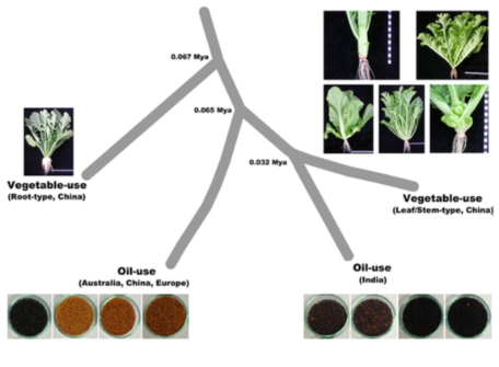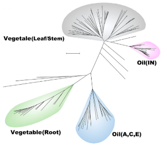 研究中還發現了Vegetable (Root)型最先分化,然后是Oil (A,C,E),最后是Oil (IN) 與Vegetable (Leaf/Stem)的分化,并計算分化時間,分別是:0.067 Mya,0.065 Mya和0.032 Mya