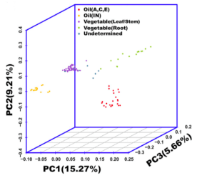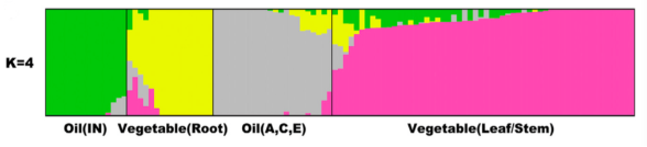 利用主成分分析來評估遺傳變異,分析結果顯示主要分為4個群:Vegetable(Leaf/Stem),Vegetable (Root),Oil (IN)和Oil (A,C,E),該結果與系統發育樹結果一致。