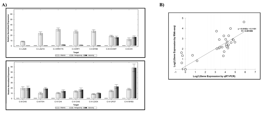 隨機挑選 14 個基因進行 RT-RCR 驗證,結果表明 Cluster I和Cluster II 中的基因(JAZ8, JAZ10, WRKY75, ERF1 和 MYB9)在 Hongyoung 的表達量較高;ClusterIV中的基因(MYB3和UFGT)在Jayoung中表達水平較高;而 Cluster III 中的基因在 Hongyoung 和 Jayoung 中的表達水平無明顯差異。RNA-seq和RT-PCR相關性系數0.89,進一步證明測序結果的準確性。