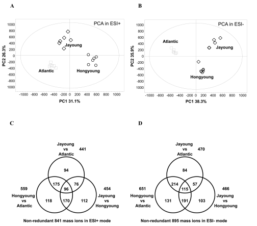 對三種不同色澤馬鈴薯樣本進行主成分分析,結果顯示不同品種馬鈴薯代謝物差異顯著。代謝組檢測表明,在正離子模式下,共檢測出841個信號離子,其中Hongyoung和Atlantic共有559個信號離子,Jayoung 和Atlantic 共有441個信號離子,Jayoung 和Hongyoung 共有 454 個信號離子;在負離子模式下,共檢測出895個信號離子,其中Hongyoung 和 Atlantic共有 651 個信號離子,Jayoung 和Atlantic 共有470個信號離子,Jayoung和Hongyoung共有 466 個信號離子。