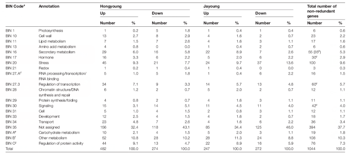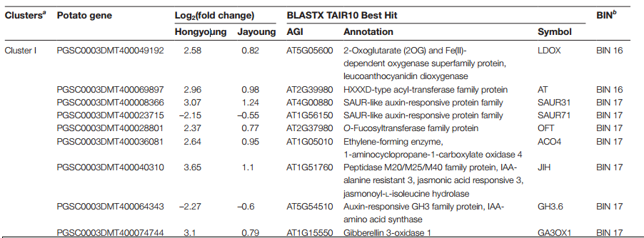 Hongyoung 、 Jayoung和Hongyoung 和 Jayoung共1044個差異基因;Hongyoung 和 Atlantic 中有 756 個差異基因,其中482 個基因上調,274 個基因下調。Jayoung 和 Atlantic 中有519 個差異基因,其中有248個上調基因,273個下調基因。根據其注釋功能將其分為20組(主要BIN),分為未知注釋轉錄本(37.7%),蛋白質活性調控(10.3%),應激(9.6%) ,其他代謝(7.3%),轉錄調控因子(5.7%),次級代謝(5.3%)和信號傳導(4.0%)。