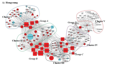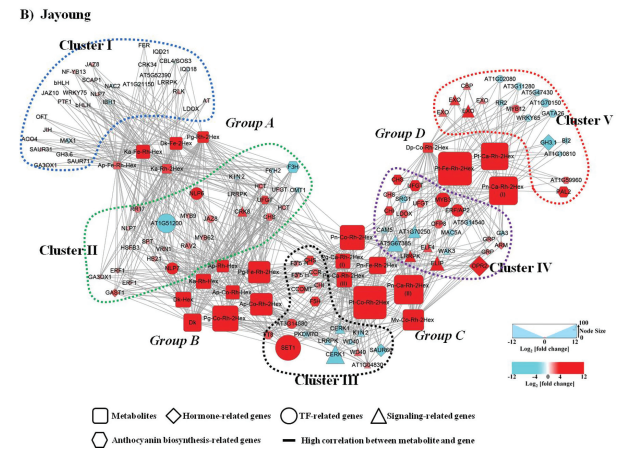 Hongyoung中 Group A 代謝物的含量高于Jayoung,與 Cluster I 和 Cluster II 中的基因有較高的關聯性。而在 Jayoung 中 Group D 代謝物的含量較高,與 Cluster IV 和 Cluster V 中的基因有較高的關聯性。