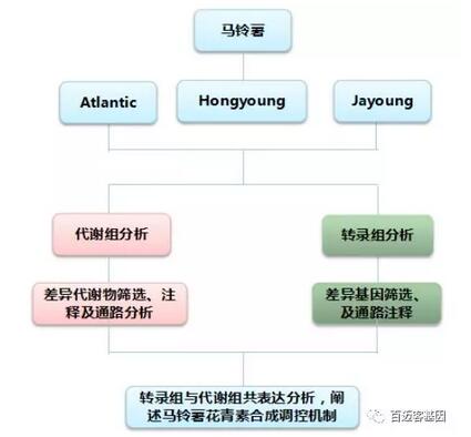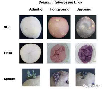 樣品準備:Hongyoung(淡紅色)、Jayoung(深紫色)、Atlantic(白色),在室溫散光照射下,誘導馬鈴薯發芽,收集嫩芽,每個品種6個生物學重復,每個重復由三個單株混合而成,共18個樣本。