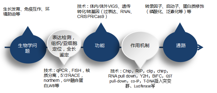 做完這部分基礎的驗證后,就需要驗證基因或ncRNA的功能,功能的驗證主要分兩類:獲得性研究和缺失性研究,獲得性研究即通過VIGS或遺傳轉化/轉基因讓目的基因過表達,缺失性研究即用RNAi、CRISPR/Cas9等技術讓目的基因沉默或突變為無功能基因。通過這部分研究可以驗證目的基因的功能。