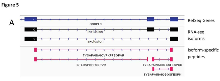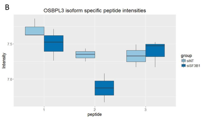 約65%的顯著差異表達的splice-specific-peptides在RNA水平上表現出一致的表達差異。例如,下調SF3B1的實驗組中,OSBPL3 9號外顯子中分別有3個支持外顯子保留和1個支持外顯子去除的peptides被鑒定出來。兩種inclusion specific-peptides表達明顯較低,而exclusion specific -peptides則與對照相比表現出較高的表達量(如圖5所示)。