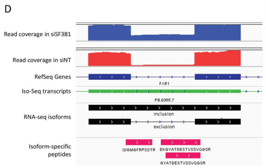 例如,全長轉錄本進行測序結果支持FXR1內含子保留的三種肽段,因此這種內含子保留事件也存在于注釋文件中。Illumina 測到的短 reads支持這一事件,并提供了定量的證據,表明它在SF3B1的下調過程中比其對照組(圖6D)更高表達。