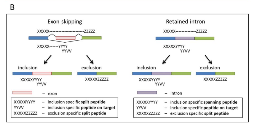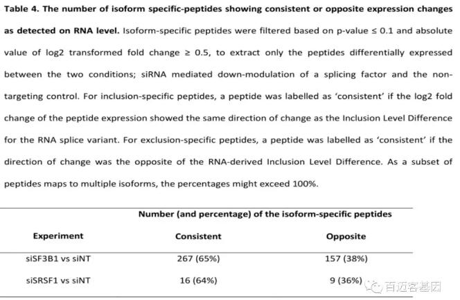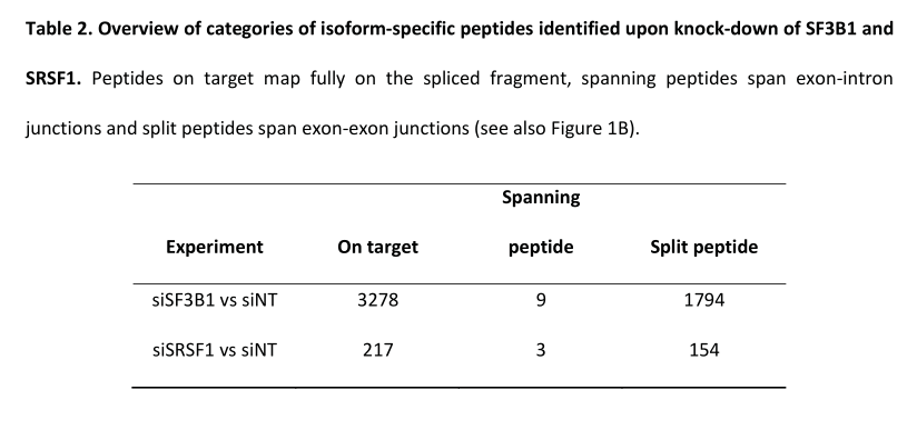 肽段數量上的差別直接和兩個實驗剪接isoform數據庫的數目相關。總的來說,大約60%的isoform特異肽段會比對到目標區域,跨越exon-econ junction的split 肽段約占40%,跨越 exon-intron junctions 的spanning肽段則很少被發現(如表2所示)。