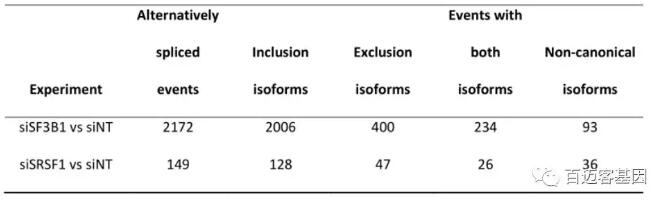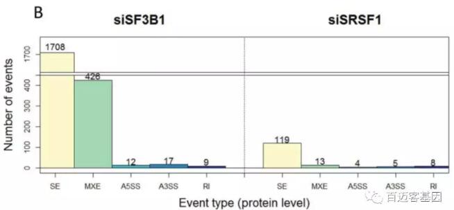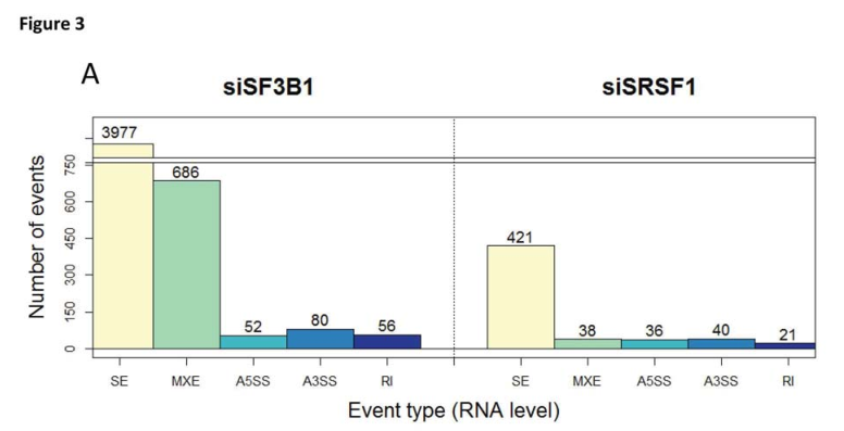 轉錄組分析顯示siSF3B1和siSRSF1的可變剪接事件與對照組相比有顯著差異(圖3A),證明對剪接因子的操作導致了差異剪接的產生。
