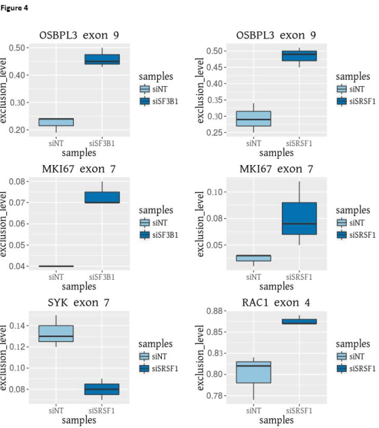 為了進一步驗證,作者選擇了4個外顯子跳躍事件進行RT-qPCR驗證,包括SYK exon 7, RAC1 exon 4, OSBPL3 exon 9, MKI67 exon 7(如圖4所示)。根據RNA-seq分析,所有的事件在SRSF1下調后都發生了差異剪接,而OSBPL3和MKI67則受SF3B1下調的影響。