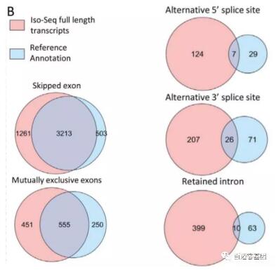 在研究可變剪接方面,Iso-Seq測到的全長轉錄本對基因組注釋結果是一個極大補充,尤其在內含子保留、3 ‘可變剪接和5 ‘端可變剪接事件中,Iso-Seq測到的全長轉錄本與基因組注釋的重疊較小。這表明,基因組注釋中缺少一些完整的或部分的內含子序列可變剪接的isoform形式。