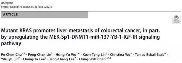 3月21日,Nature旗下癌癥雜志Oncogene在線發表了來自臺灣中央研究院生物化學研究所等機構的一項研究成果。該研究發現,KRAS基因突變通過上調MEK—Sp1K—DNMT1K—miR-137K—YB-1K—IGF-IR信號通路促進結直腸癌的肝轉移。這為MEK抑制劑作為輔助藥物與標準治療藥物聯合使用,防止KRAS突變的CRC患者在接受肝臟切除手術之后復發,提供了理論支持。