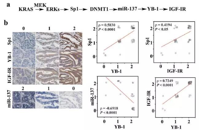 盡管我們都知道胰島素樣生長因子I受體(IGF-IR)能夠促進結直腸癌的肝轉移,但是并不清楚腫瘤是通過哪種機制上調IGF-IR表達。研究發現在結直腸癌細胞中,KRAS突變體通過MEK—Sp1—DNMT1—miR-137信號通路上調Y-box結合蛋白1 (YB-1),進而轉錄激活IGF-IR基因表達。后續46例KRAS突變的CRC患者肝轉移免疫組織化學評估試驗也進一步證實這一發現,Sp1、 miR-137、YB-1和IGF-1R之間的表達顯著相關。在動物模型中,通過基因敲減或MEK藥物抑制下調YB-1和IGF-IR的表達,可阻止KRAS突變的結直腸癌肝轉移。