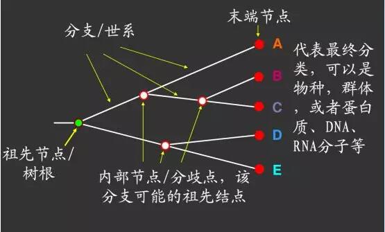 系統發育分析中,最重要和最常見的內容為構建系統發育樹。系統發育樹也稱為系統發生樹(phylogenetic tree)、聚類樹或者進化樹(evolutionary tree)。以樹狀結構表示各個節點的進化關系,枝點可以是物種、同一物種的樣本、基因等單元。系統進化樹中各個元素的介紹如圖1所示