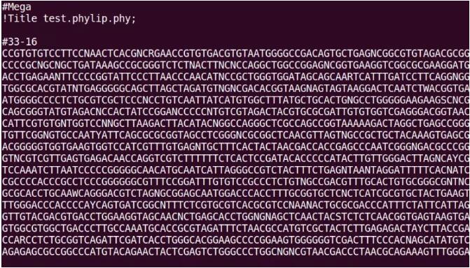 VCF轉MEGA格式。用TASSEL打開VCF文件,另存為Phylip格式(Save As — ?Phylip(Interleaved)),如圖3,然后用MEGA7把Phylip文件轉換成MEGA格式(File — Convert File Format to MEGA — 選擇剛才轉出的Phylip文件按提示操作存成.meg文件),轉出的格式如圖4,前兩行為文件頭信息,無實際意義,但是必有。“#33-16”表示樣本編號,與fasta文件的格式不同,mega格式樣本的起始不是“>”而是“#”,接下來便是該樣本的SNP連接成的序列信息。