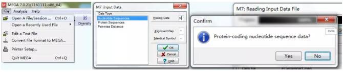File — Open A File/Session — 選擇要導入的文件,選擇數據類型(如果是SNP即為Nuceotide Sequences),提示Protein-coding nucleotide sequence data時,選擇No,即不把DNA序列翻譯成蛋白序列構建進化樹,如圖5。