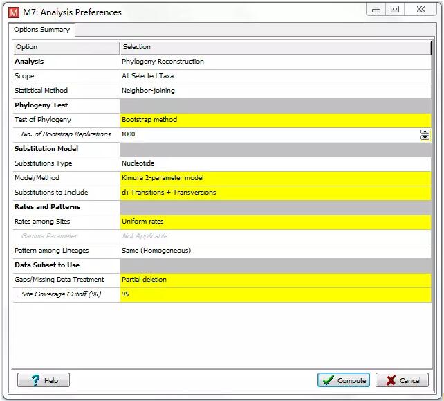 參數設置,主要填寫Bootstrap值,一般選擇500或1000次;Model一般用Kimura 2-parameter Model(K2),如果K2模型運行不了,可以換成p-distance模型;Gaps/Missing Data Treatment選擇Partial deletion或者pairwise deletion,選擇complete deletion時帶有缺失值的標記都會被刪除,所以必須謹慎;Site Coverage Cutoff與我們常說的完整度相同,一般填寫成我們過濾標記時使用的完整度,上述參數設置完成后,點擊compute即可。(見圖6)