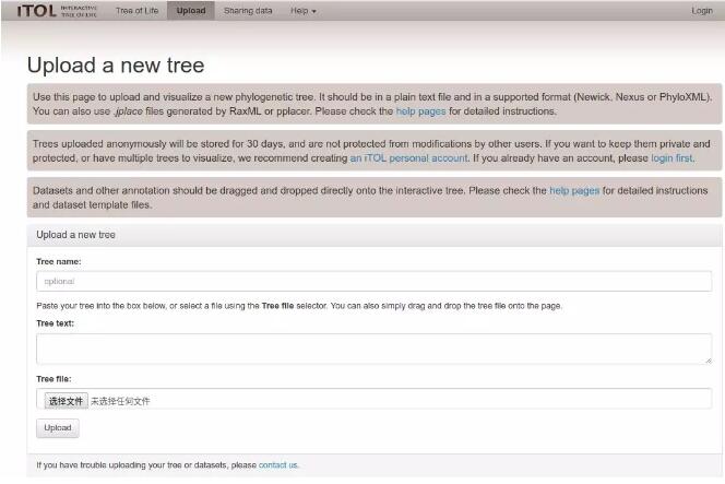 1、打開iTOL主頁以后,選擇上端的Upload選項,出現輸入界面后,可以在Tree text框中粘貼nwk中的內容,也可以通過【選擇文件】選項選擇需要展示的進化樹,之后點擊Upload即可。