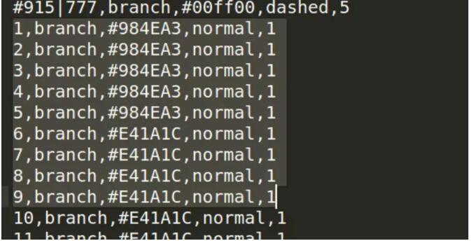 2、進化樹著色,按照iTOL的要求,填寫一個顏色配置文件,填寫方法如該鏈接的說明https://itol.embl.de/help/colors_styles_template.txt,給末端分枝著色的配置文件填寫如下圖,[2,branch,#984EA3,normal,1]中2為樣本ID,branch表示給樹枝上色,#984EA3為16進制顏色代碼,normal表示線條的樣式為正常的實線,1表示枝條的大小為1,該文件必須以.txt結尾,填寫完成后,將其拖入進化樹的界面即可。