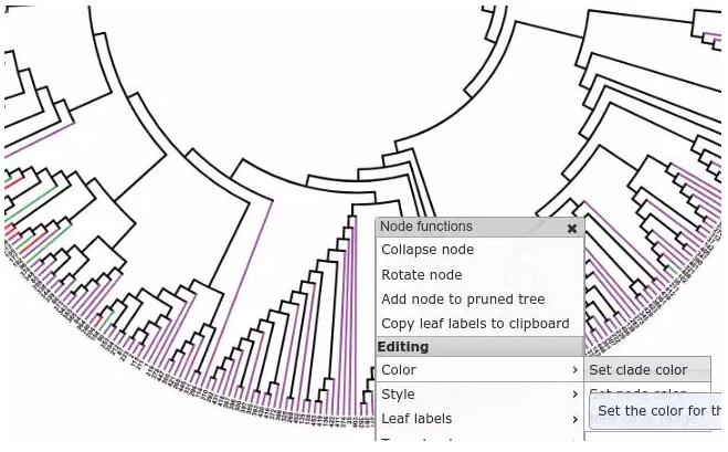 4、分枝顏色的統一。上面的著色例子只對末端分枝進行了著色,有時候,我們需要對某個分枝的樣本進行顏色的統一,可以選中該分枝并點擊鼠標,在彈出的下拉框中選擇color — set clade color — 選擇想用的顏色或填入對應的顏色代碼即可。