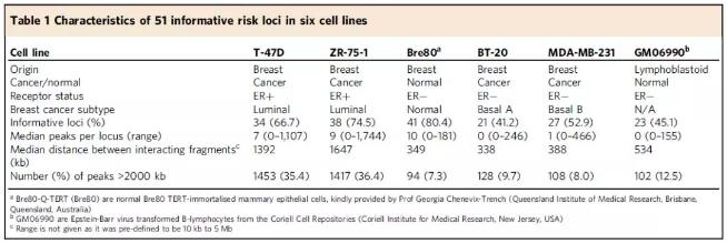 在2種ER +乳腺癌細胞系(T-47D,ZR-75-1)、2種ER-乳腺癌細胞系(BT-20,MDAMB-231)、1種“正常”乳腺上皮細胞系 (Bre80-Q-TERT/Bre80)和1種非乳腺類淋巴母細胞系(GM06990)中進行了CHi-C測序。風險基因座定義為包含至少1個風險SNP位點在內,且包含與該SNP相關(r2>0.2)的所有SNP的一個連續區域。每個細胞系的互作peak數目在0-1744的范圍內,有12個基因座沒有在以上任何一種細胞系中鑒定到互作peak。剩余的51個loci中46個是與所有乳腺癌或者ER+乳腺癌風險相關的。