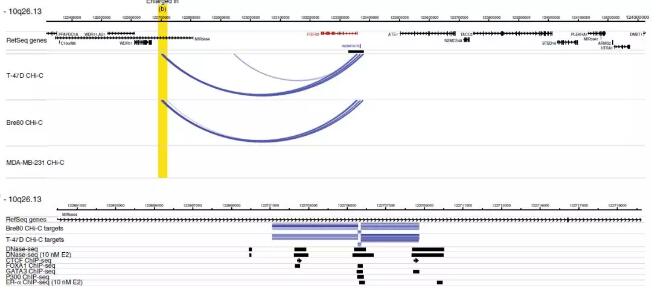 互作peak示例:下圖為10q26.13基因座的互作peak(loop),在ER+乳腺癌細胞系和正常乳腺上皮細胞系中鑒定到了互作peak,但是ER-乳腺癌細胞系中則未檢測到。互作靶基因的轉錄起始位點(TSS)位于捕獲區域內,并且和相距幾百Kb遠的特異的HindIII酶切片段形成環(互作Peak)。在T-47D細胞系中,這些遠距離片段與DNase I超敏位點、CTCF、FOXA1、GATA3轉錄因子結合位點以及雌激素受體ERα結合位點共定位。