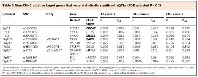 為了評估推定的靶基因在乳腺癌病因中具有因果作用的可能性,作者首先使用風險SNP(或與風險SNP連鎖不平衡的位點,r2> 0.8)和TCGA數據庫中的RNA-Seq數據(N=547)進行eQTL分析( TCGA),并對匹配的DNA甲基化數據和體細胞拷貝數變異進行了校正,根據ER狀態進行分層分析。共計鑒定到了22個顯著SNP-基因組合(t檢驗p<0.05),其中9個經過多重檢驗FDR校正后仍然顯著。其中,3個基因為鄰近基因。